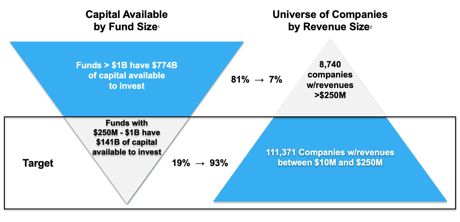 The lower middle market represents a substantial portion of the private markets and is sometimes considered by market participants to be relatively underserved, which may suggest favorable dynamics for investors.